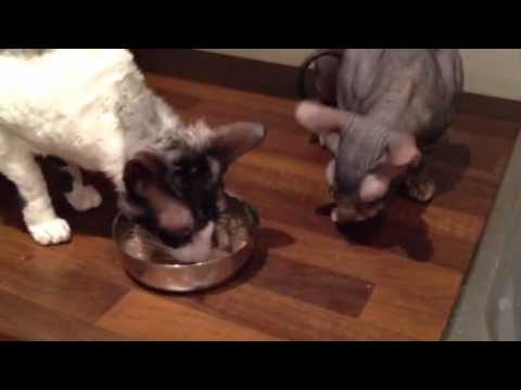 K9 Natural Lamb }}- A Don Sphynx and a Cornish Rex trying K9 raw food.